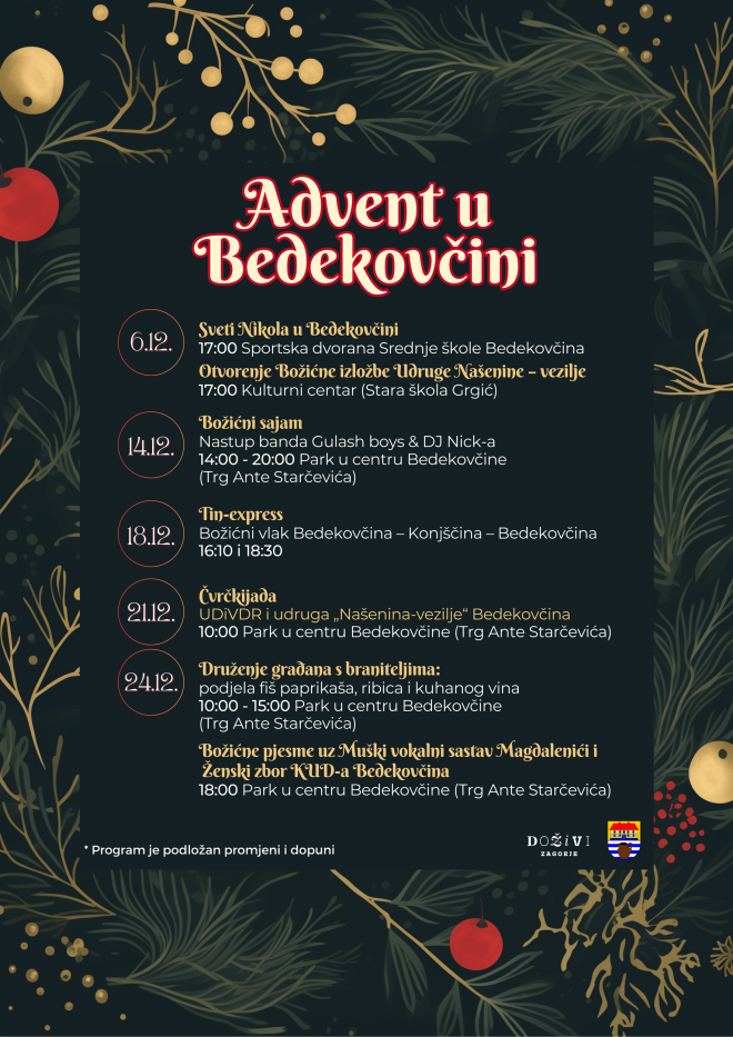 Advent u Bedekovčini: Uz zabavni sadržaj očekuje vas i bogata ugostiteljska ponuda Autor: zagorje.com 29 studenog, 2024. 15:19 ispis Tweet Share on Facebook Plus on Google+ Advent će se ponovno održati i u Bedekovčini, a što vas sve, uz ugostiteljsku ponudu, očekuje, pogledajte u nastavku: