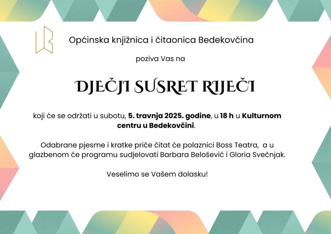 U Kulturnom centru u Bedekovčini u subotu, 5. travnja 2025. godine, održat će se prvi Dječji Susret riječi, događaj koji slavi kreativnost i literarni izričaj najmlađih. Tom prilikom bit će dodijeljene nagrade najboljim mladim autorima, a njihovi odabrani prozni i pjesnički radovi bit će predstavljeni publici.