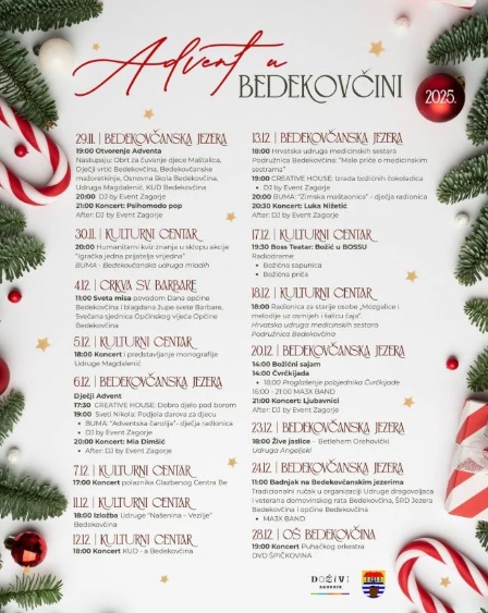 Treća adventska subota, 13. prosinca, donosi Advent dobre energije. Hrvatska udruga medicinskih sestara priprema program 'Male priče o medicinskim sestrama’, dok Bedekovčanska udruga mladih organizira dječju zimsku maštaonicu. Večer završava velikim koncertom Luke Nižetića.