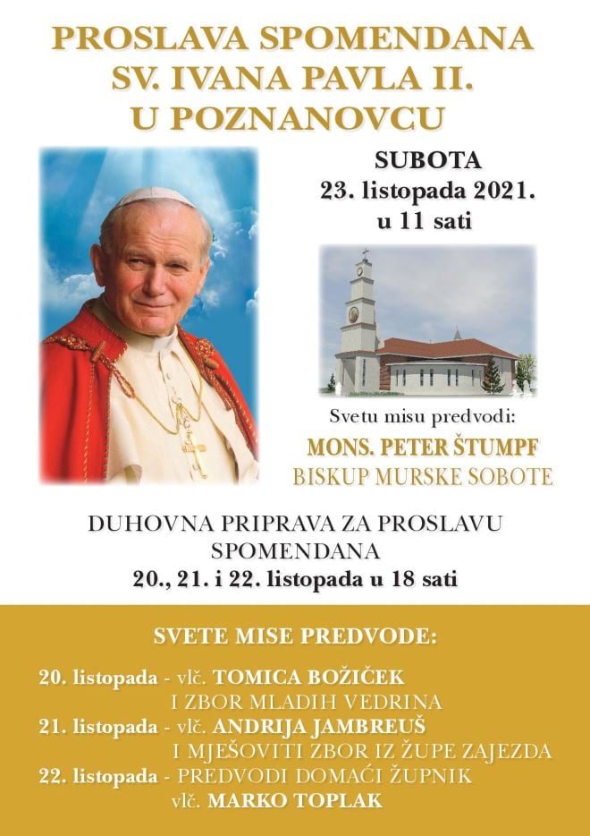 Marko Toplak, upravitelj župe Mače kojoj pripada filijalna crkva u Poznanovcu, podsjeća na proslavu spomendana sv. Ivana Pavla II. u Poznanovcu. Slavlje će se održati po epidemiološkim mjerama koje su na snazi ili će biti u tom trenutku na snazi (držanje potrebnog razmaka, nošenje zaštitne maske i dezinfekcija ruku na ulazu u crkvu). Prečasni Toplak nada se da ćemo moći svečano obilježiti spomendan svetog pape.