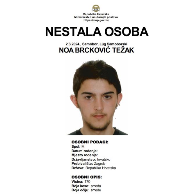 Isto tako, s adrese u Samoboru, odnosno u Lugu Samoborskom, udaljio se u nepoznato i 18-godišnji Noa Brcković Težak