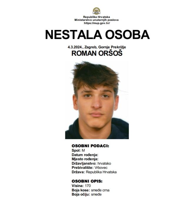 Tako je iz svoje obiteljske kuće u Zagrebu, na Gornjem Prekrižju, u nepoznatom pravcu otišao 18-godišnji Roman Oršoš.