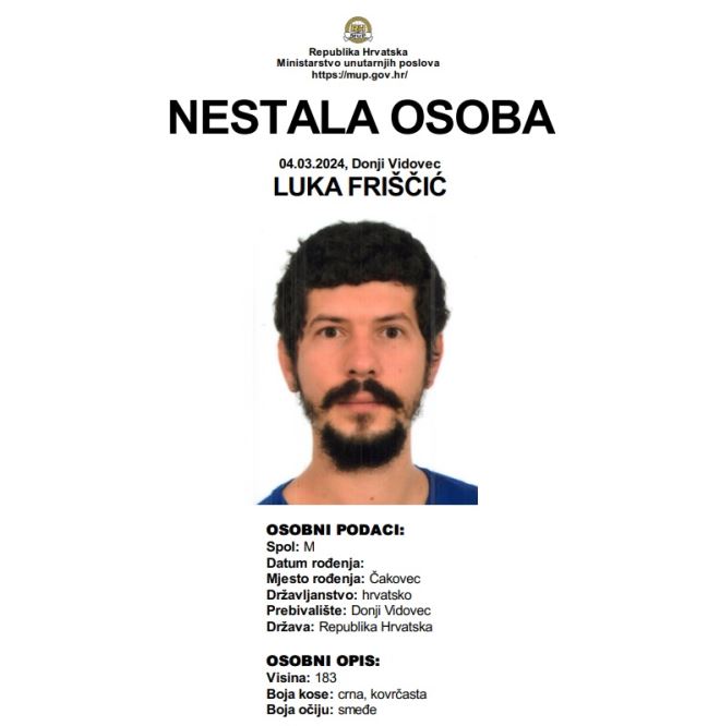 Potom je u Donjem Vidovcu nestao Luka Friščić. Na stranici nestali.hr navodi se da je u trenutku nestanka na sebi imao crnu zimsku kožnu jaknu i zelenu majicu s kapuljačom.