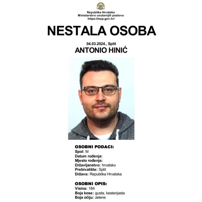 U Splitu pak je nestao Antonio Hinić, visok 184 cm, koji ima gustu, kestenjastu kosu i zelene oči.