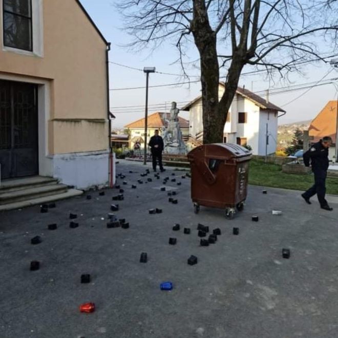 Pred glavnim ulazom u crkvu netko se pomokrio, a na crkvena vrata prema groblju postavljen je križ okrenut naopako. Od tih vrata do glavnog ulaza u crkvu razbacane su crne kutijice, a s jednog groba odlomljen je i razbijen kip Blažene Djevice Marije.