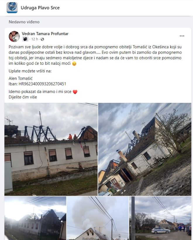 "Pozivam sve ljude dobre volje i dobrog srca da pomognemo obitelji Tomašić iz Okešinca koji su danas poslijepodne ostali bez krova nad glavom..... Evo ovim putem bi zamolio da pomognemo toj obitelji, jer imaju sedmero maloljetne djece i nadam se da će vam to otvoriti srce pomozimo im koliko god će to bit našoj moći.