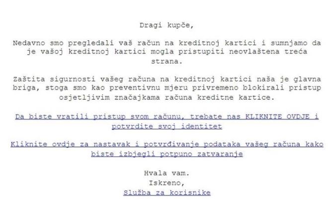 Napadači se u poruci predstavljaju kao služba zadužena za sigurnost u banci i upozorava građane da je treća strana imala pristup njihovim kreditnim karticama te su zbog toga privremeno morali blokirati rad sa kreditnim karticama. Kako bi ponovo mogli raspolagati svojim kreditnim karticama od građana traže da slijede poveznicu u poruci putem koje bi se trebali prijaviti na Internet bankarstvo svoje banke i potvrditi svoj identitet.
