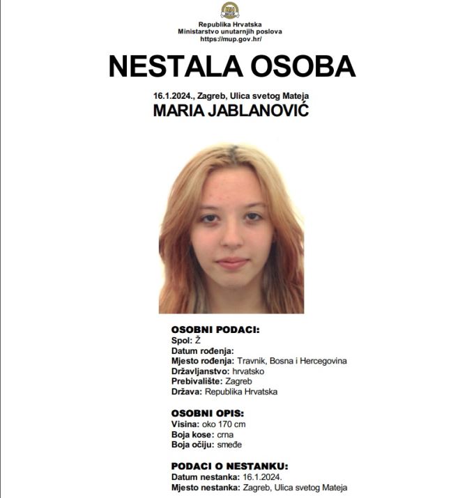 Kao je objavila policija na stranici Nestali.hr, jučer je u Zagrebu, iz lokacije u Ulici svetog Mateja, nestala 16-godišnja Maria.