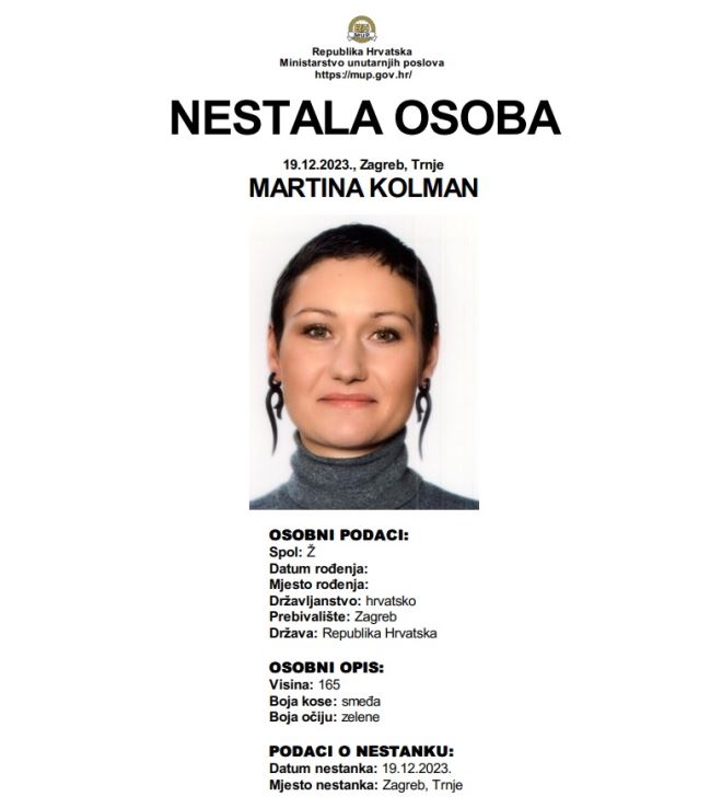 Još 19. prosinca 2023. godine, dakle, prije 25 dana, nestala je 40-godišnja Martina Kolman, kada se udaljila iz svog prebivališta u zagrebačkom Trnju.