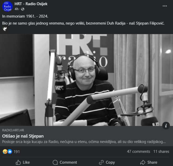 Hrvatska novinarska scena doživjela je danas, nažalost, još jedan tragičan gubitak. Sa HRT Radio Osijeka stigle su tužne vijesti o smrti njihovog dugogodišnjeg novinara, reportera, urednika, spikera i voditelja spikerske škole, Stjepana Filipovića.