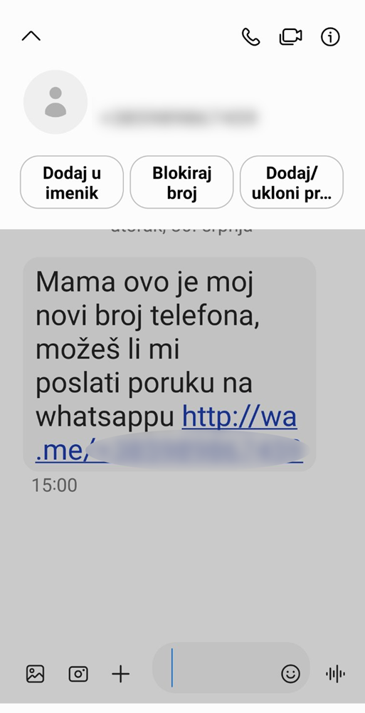 No, poruka ne mora stići isključivo putem SMS-a. Naime, u srpnju je zagorskoj policiji jedna 68-godišnjakina prijavila da je putem WhatsApp-a zaprimila poruku od osobe koja s predstavila kao njezina kći te da ima financijskih problema koje mora hitno riješiti. 68-godišnjakinja je sukladno uputi u poruci poslala podatke o računu i odobrila novčanu transakciju od nekoliko tisuća eura misleći da novac šalje kćeri. Nakon transakcije, zaprimila je još jedan zahtjev za uplatu novca nakon čega je kontaktirala kćer i shvatila kako se radi o prijevari. Nažalost, shvatila je to prekasno, nakon što je ostala bez nekoliko tisuća eura.