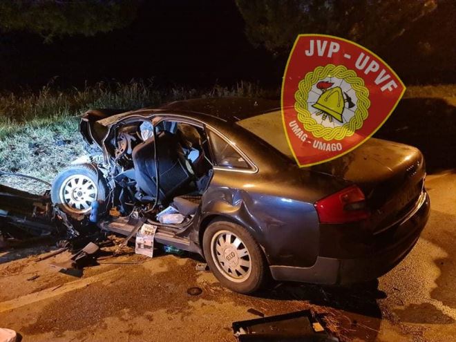 Vatrogasci Javne vatrogasne postrojbe Umag objavili su jezive fotografije smrskanog Audija koje najbolje svjedoče o silnici udara u kojem je mladić izgubio život.