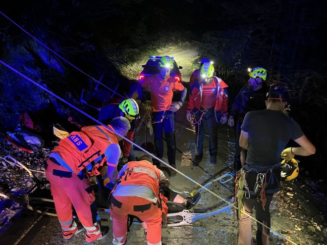 "U nedjelju, 08.10.2023, zaprimamo dojavu putem centra 112 o slijetanju osobnog automobila na makadamskoj cesti Ivanščica – Prigorec oko 20:00h. Na teren odmah izlazi 12 članova stanice Varaždin zajedno sa ostalim interventnim službama – HMP, DVD i MUP. U automobilu, koji je sletio 40-ak metara na izrazito strm i nepristupačan teren, nalazile su se 4 osobe sa ozljedama izvan životne opasnosti. Djelatnici hitne medicinske pomoći prvi su stigli na mjesto nesreće te odmah zbrinuli ozljede – ozljeda glave, prijelom ruke, nagnječenja prsnog koša. Među unesrećenima je bila i jedna trudnica. Nakon dolaska na teren članovi HGSS-a izrađuju sisteme za podizanje te uz pomoć brdskih nosiljki izvlače unesrećene do glavne makadamske ceste. Unesrećeni su predani hitnoj službi oko 21:00h. Akcija je završila povratkom članova u oružarstvo te raspremanjem opreme i nezaobilaznom analizom akcije."