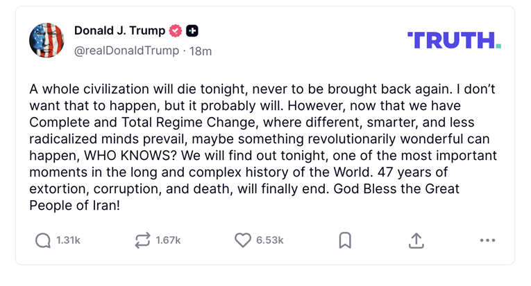 Trump: Cijela jedna civilizacija će večeras umrijeti!