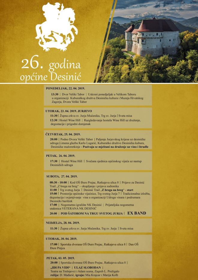 U utorak, na sam blagdan sv. Jurja sveta misa je u župnoj crkvi u 11.30, a u 12.30 sati moći će se razgledati novootvoreni hostel Wine Hill. U četvrtak 25. travnja od 20 sati podno Velikog Tabora zapalit će se krijes te se pozivaju mještani na druženje uz vino i štrudle. U petak 26. travnja bit će održana svečana sjednica Općinskog vijeća u 17.30 sati u hostelu Wine Hill uz nastup desinićkih udruga. Subota, 27. travnja rezervirana je za trail utrku Z brega na brega, start je u 11 sati. Od 15 sati održat će se izložba, degustacija i ocjenjivanje vina Udruge vinara i podrumara Desinićki barilček, od 17 sati počinje prijateljska nogometna utakmica veterana NK Desinić, a od 20 sati pod šatorom zabava uz Ex bend.