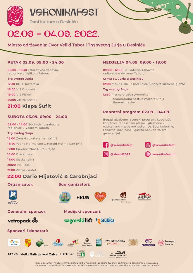 Danas je u Desiniću započela nova manifestacija, Veronika fest. Iako je ovo tek prvo izdanje, manifestacija je privukla velik broj izvođača i posjetitelja, ali i, osim domaćih, i strane goste.