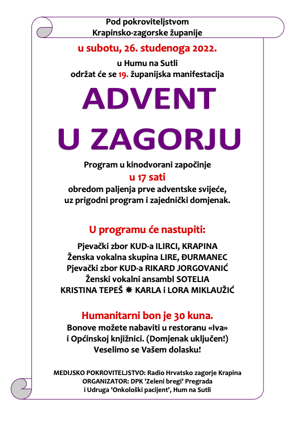 Pod pokroviteljstvom Krapinsko-zagorske županije, DPK „Zeleni bregi“ Pregrada i Udruga „Onkološki pacijent“, iz Huma na Sutli, uoči prvog dana Adventa organiziraju 19. županijsku manifestaciju „ADVENT U ZAGORJU“, uz obred paljenja prve županijske adventske svijeće.