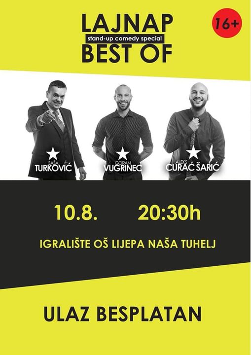 Tako će se ove srijede, 10. kolovoza, na igralištu OŠ Lijepa naša u Tuhlju, održati Stand up comedy special – Lajnap best off, na kojem će nastupiti komičari Aleks Curać Šarić, Saša Turković i Goran Vugrinec. Riječ j trojcu koji će vas nasmijati do suza u više od 90 minuta njihovih najjačih fora.