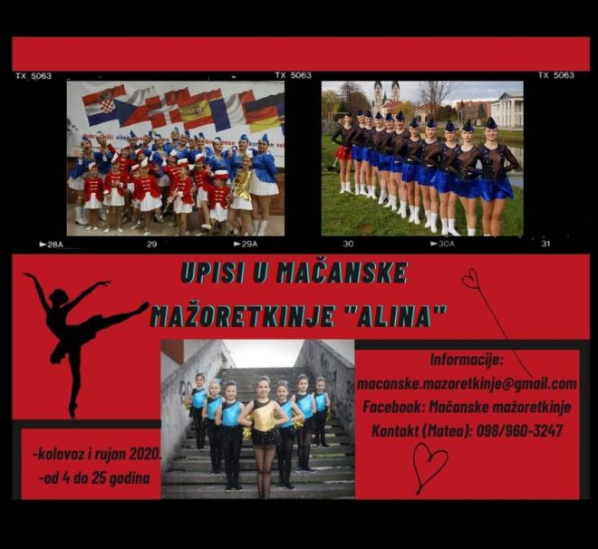 Mačanske Mažoretkinje Alina pozivaju sve zainteresirane djevojčice i dječake koji vole ples i putovanja da se pridruže timu. Upisi traju tijekom kolovoza i rujna. Treninzi se održavaju svaku srijedu od 18 do 20 sati i subotom od 10 do 12 sati. Za sve dodatne informacije možete ih kontaktirati na [email protected], Facebook Mačanske mažoretkinje i na broj 098/960-3247.