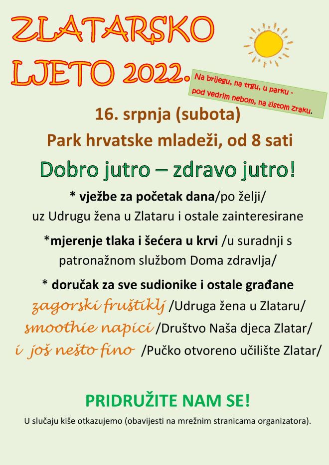 U nastavku Zlatarskog ljeta, u subotu, 16. srpnja, održat će se program pod nazivom „DOBRO JUTRO – ZDRAVO JUTRO!”, vježbanje za razbuđivanje i doručak. Početak je u 8 sati, u Parku hrvatske mladeži, a organizatori su POU dr. Jurja Žerjavića, Udruga žena i Društvo Naša djeca.