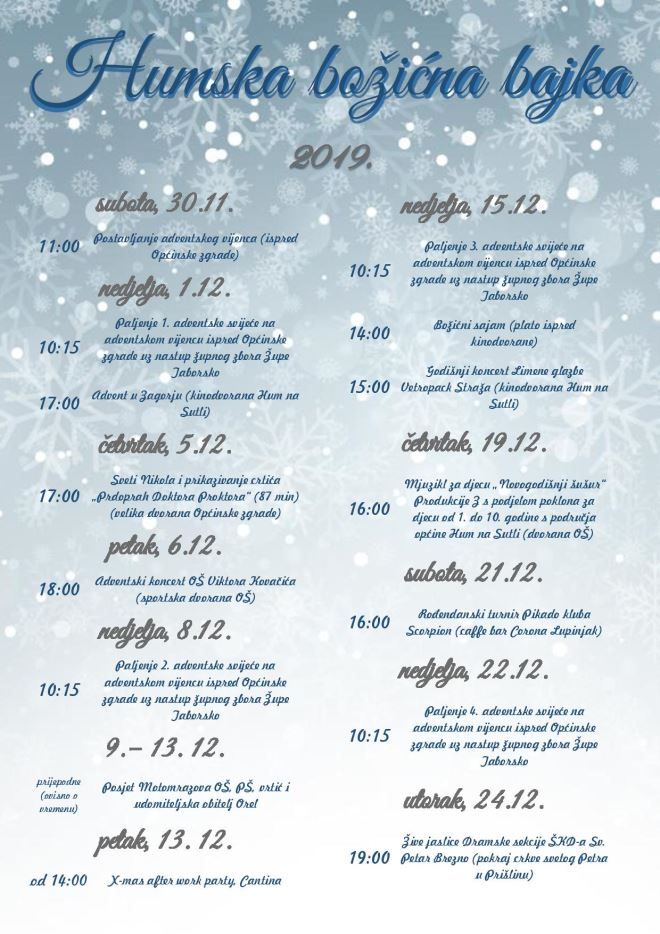 Postavljanjem adventskog vijenca ispred općinske zgrade u subotu 30. studenoga u 11 sati počinje manifestacija Humska božićna bajka. Paljenje prve adventske svijeće je u nedjelju 1. prosinca u 10.15 sati ispred općinske zgrade uz nastup župnog zbora Župe Taborsko. U 17 sati počinje obilježavanje županijske manifestacije Advent u Zagorju u kinodvorani. U četvrtak, 5. prosinca obilježit će se sv. Nikola i prikazati crtić Prdoprah doktora Proktora u velikoj dvorani općinske zgrade.