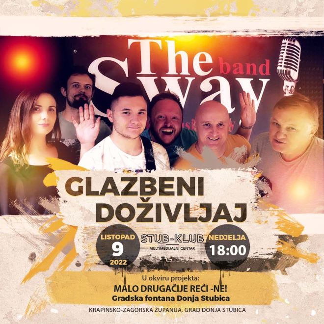 U nedjelju 9. listopada održati će se četvrti koncert u okviru projekta Malo drugačije reći - NE! koji provodi Multimedijalni centar STUB-KLUB. Na koncertu će nastupiti The Sway - zagorski pop rock cover bend koji izvode domaće i strane glazbene hitove koje "baš i ne sviraju svi i druge glazbene grupe". Koncert će se održati kod Fontane prijateljstva u Donjoj Stubici od 18 h, a dobrodošle su sve generacije građana.