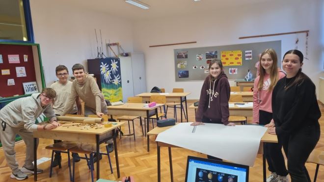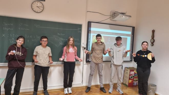 Znanstveni ton nastavio se i početkom studenoga. Dana 5. studenoga 2025., učenici 7. i 8. razreda područne škole Hrašćina, polaznici Astro grupe, sudjelovali su u radionici „Udaljenosti i veličine u Sunčevom sustavu“. Nakon što su ponovili osnovne činjenice o planetima, uz pomoć stvarnih NASA-inih fotografija istraživali su usporedne veličine planeta, njihove udaljenosti od Sunca i vrijeme obilaska oko njega. Svoje su spoznaje pretočili u praktičan zadatak. Izradili su model Sunčeva sustava pomoću špage duge 4,5 metra, na kojoj su, prema izračunatim omjerima, rasporedili planete od Sunca do Neptuna. Iako se zadatak u početku činio jednostavnim, učenici su uvidjeli koliko je preciznosti i suradnje potrebno da bi model bio točan. Na kraju radionice ponosno su promatrali svoj rad.