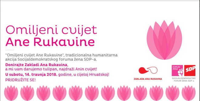 Socijaldemokratski forum žena SDP-a, Forum mladih SDP-a i lokalne organizacije SDP-a priključit će se i ove godine nacionalnoj akciji Zaklade Ana Rukavina pod nazivom „Omiljeni cvijet Ane Rukavine“. Akcija će se održati 14. travnja od 9 sati u Zaboku, Pregradi, Krapinskim Toplicama, Tuhlju, Klanjcu, Oroslavju, Zlataru, Stubičkim Toplicama, Donjoj Stubici, Gornjoj Stubici i Loboru. Omiljeni cvijet Ane Rukavine" tradicionalna je humanitarna akcija Socijaldemokratskog foruma žena SDP-a za Zakladu Ana Rukavina. Organizirana na poticaj SDFŽ-a Zagreba, akcija je danas prepoznatljivo događanje kojim obilježavamo rođendan Ane Rukavine, a prodajom tulipana - njezina najdražeg cvijeta prikupljamo donacije za Zakladu