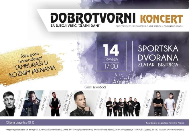 Ulaznice se mogu pronaći u pretprodaji od 04. travnja na lokacijama: Dječji vrtić Zlatni dani (Zlatar Bistrica), Caffe bar Štacija (Zlatar Bistrica), Bar Bar (Marija Bistrica), City Caffe (Zabok), Stara pošta (Zlatar), Bistro-pizzera Savanna (Konjščina). Od izvođača nastupit će: Maligani, Siniša Biško, Frano Pehar (Tarapana Band), Ivan Zak, Mejaši, Od srca do srca te tajni gost iznenađenja "Tamburaši u kožnim jaknama".