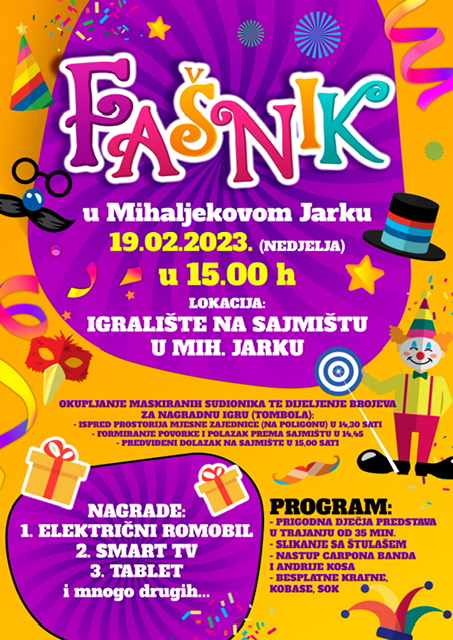 U nedjelju 19. veljače održat će se maškare u Mihaljekovom Jarku. Okupljanje sudionika i dijeljenje brojeva za tombolu najavljeno je za 14:30, ispred prostorija Mjesne zajednice na poligonu u Krapini. Povorka će se formirati te krenuti prema sajmištu, gdje bi program trebao početi u 15 sati.