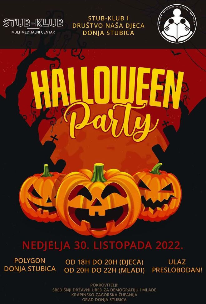STUB-KLUB i Društvo naša djeca Donja Stubica organiziraju ove nedjelje 30. listopada glazbeno scenski spektakl - Halloween party, poznatiji kao Noć vještica. Velika zabava za djecu, mlade i odrasle sa vješticama, čarobnjacima, coprnjacima, trolovima i šišmišima uz mnoštvo audio vizualnih sadržaja održat će se u parku za ekstremne sportove Polygon u Kolodvorskoj 16 u Donjoj Stubici. - Kostimirajte se u skladu s Halloweenom i dođite u Donju Stubicu! Za mlađu djecu zabava započinje od 18 sati, a za mlade i stariju populaciju od 20 sati. Ulaz za sve posjetitelje i sudionike je besplatan – pozivaju organizatori.