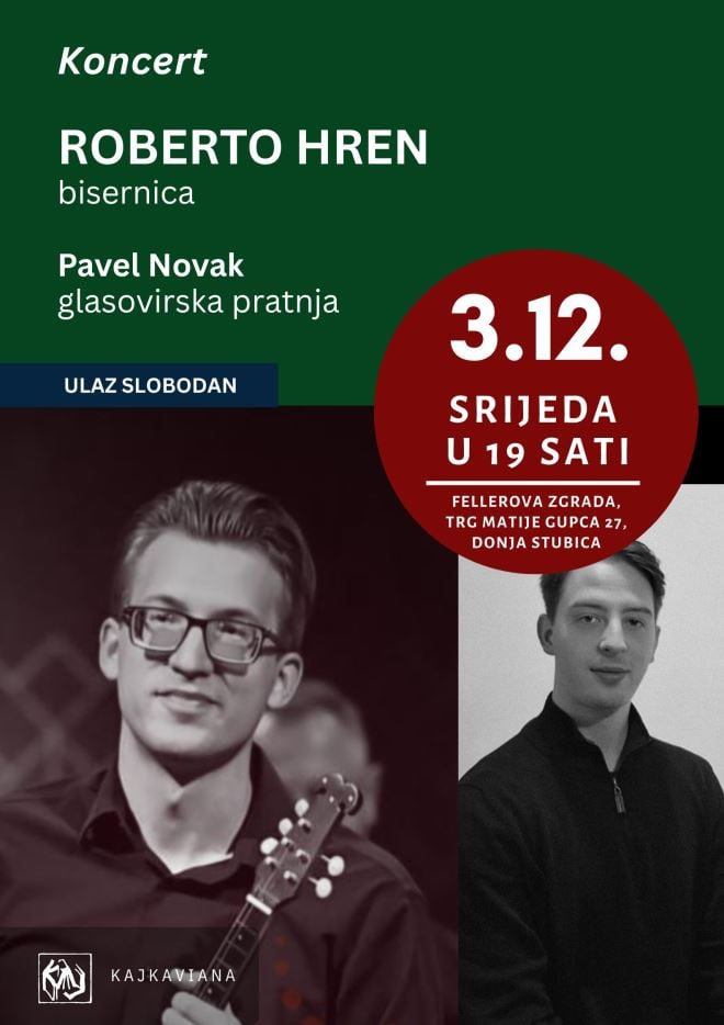 U srijedu, 3. prosinca 2025. u 19 sati u prostorijama Kajkaviana (Fellerova zgrada, Donja Stubica) održat će se koncert Roberto Hren uz glasovirsku pratnju Pavel Novak.