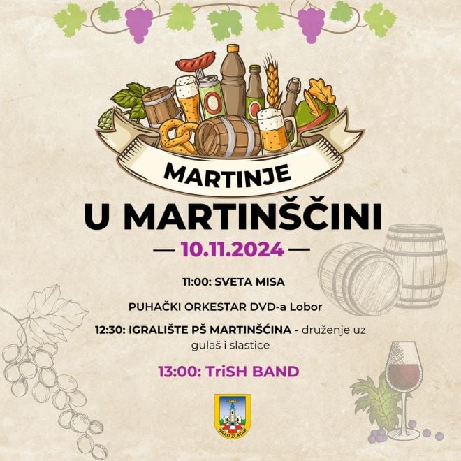 U nedjelju 10. studenog održat će se tradicionalno „Martinje u Martinščini” u organizaciji Grada Zlatara i TZP Zlatni istok Zagorja. Sveta misa s prigodnim programom u kapeli sv. Martina najavljena je u 11 sati. Nastupit će Puhački orkestar DVD - a Lobor, a od 12.30 na igralištu Područne škole priprema se druženje uz gulaš i slastice te svirku Trish banda.