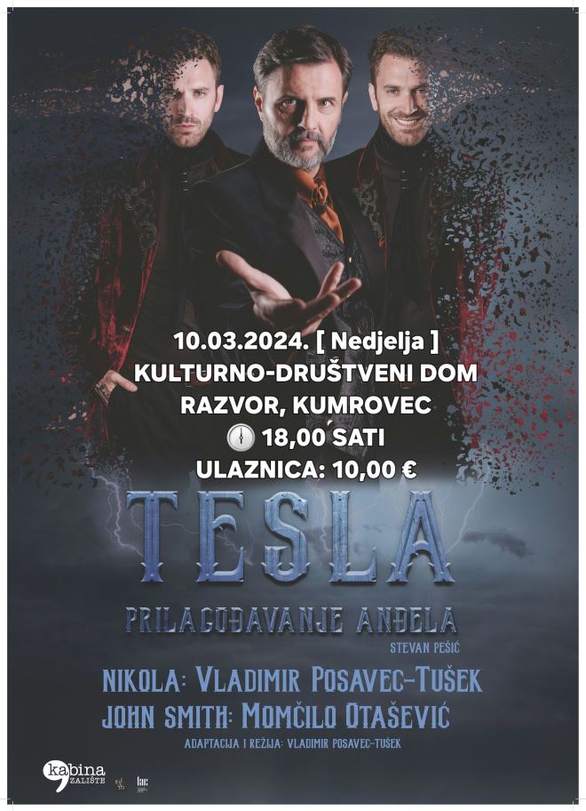 U Kumrovcu u Kulturno-društvenom domu, u nedjelju 10.03.2024. s početkom u 18 sati bit će prikazan događaj koji se odvijao u posljednjem satu života Nikole Tesle.