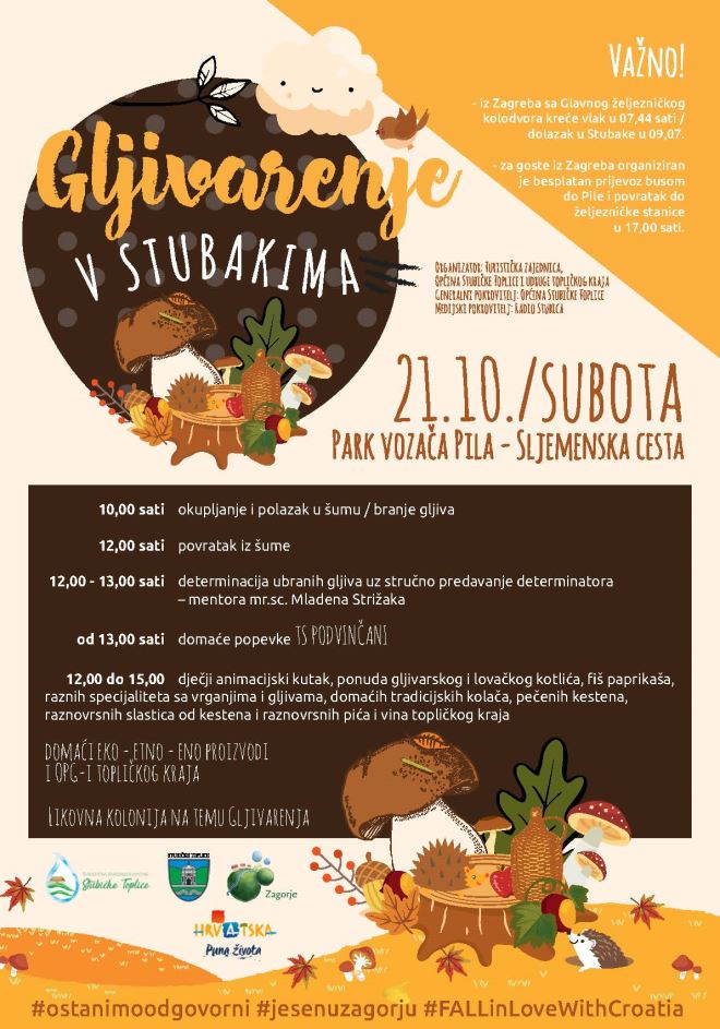 Turistička zajednica Općine Stubičke Toplice, Općina Stubičke Toplice i udruge topličkog kraja organiziraju još jedno ''Gljivarenje v Stubakima''. Ove godine održat će se u subotu 21. listopada u 10 sati u Parku vozača Pila.