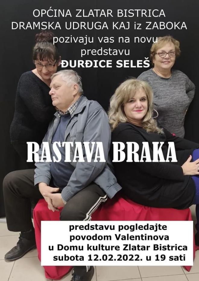 Općina Zlatar Bistrica i Dramska udruga „KAJ“ iz Zaboka, pozivaju, povodom Valentinova, na novu komediju, autorice i režiserke Đurđice Seleš, „Rastava braka“.