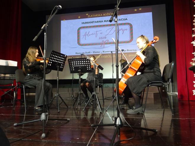 U prigodnom programu koji je slijedio prvi je nastupio Crkveni zbor Uznesenja Blažene Djevice Marije s nekoliko prigodnih adventskih pjesama, pod dirigentskim vodstvom župnika Cerovečkog. Za mnoge u Sokolani njihov je nastup bio ugodno iznenađenje i dokaz kakvi se pjevački dosezi mogu postići pod vodstvom sigurne glazbeno znalačke ruke ! Nastavilo se nastupom članica sekcije folklornog pjevanja KUD-a Belec, pod vodstvom Irene Kušec. U svijetu odraslih glazbenika bilo je mjesta i za tri mlade glazbenice, učenice zlatarske Osnovne škole Ante Kovačića i polaznice Osnovne glazbene škole u Mariji Bistrici. Čelistica Elena Šrajbek i violinistice Vida Domitran i Ana Popov izvele su dvije skladbe, Dona nobis pacem i Padaj s neba, a pripremio ih je prof. Matija Vučković. I ako je istinita ona narodna „šećer dolazi na kraju“, bio je to nastup triju sopranistica, članica Opere zagrebačkoga HNK, Mime Karaule, Mie Domaćina Topalušić i Ane Zebić Kostel. Nastupaju pod imenom ONE. Kakvo čisto, kristalno pjevanje sa sjajnim visinama, skladno trozvučje. Dlanovi se nisu štedjeli kad su se opraštale s publikom pjevajući „Neka cijeli ovaj svijet“ iz mjuzikla „Jalta,Jalta“.