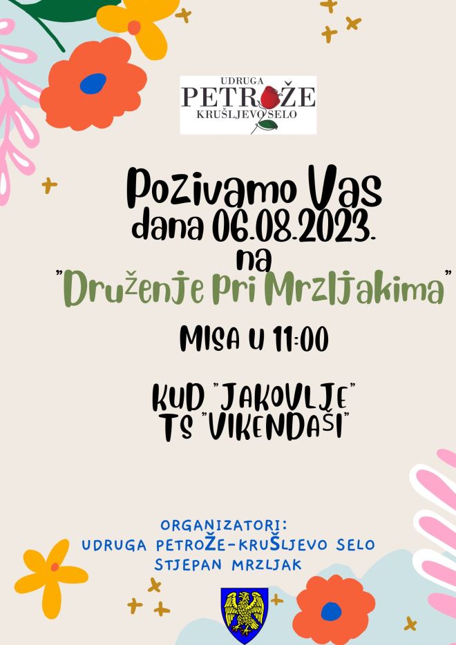 Desetu godinu zaredom, u organizaciji udruge Petrože - Krušljevo selo i Stjepana Mrzljak, ove nedjelje održat će se 'Druženje pri Mrzljakima' u Krušljevom Selu, zaseoku Mrzljaki. Udruga tom manifestacijom održava i potiče na očuvanje kulturne baštine, promicanje kulture i turizma Hrvatskog zagorja, a mlade i djecu kroz program rada udruge potiče na aktivno uključivanje u zajednici i volontiranje.