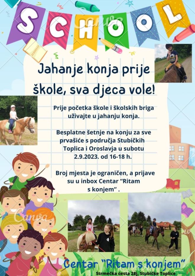 Besplatne šetnje na konju za sve prvašiće s područja Stubičkih Toplica i Oroslavja održat će se ove subote od 16 do 18 sati. Broj mjesta je ograničen, a prijave su u inbox Centar “Ritam s konjem”.
