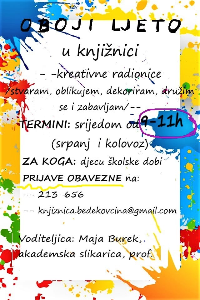 ‘Oboji ljeto u knjižnici’ naziv je kreativnih radionica koje su se ovog ljeta vratile u Općinsku knjižnicu i čitaonicu Bedekovčina. Stvaraju se razne rukotvorine, sudionici se okušaju s u novim likovnim tehnikama, istražuje se prostor svoje kreativnosti, a inspiracija su knjige. Nastali radovi krasit će izloge i prostor knjižnice.
