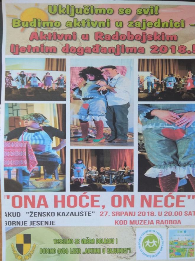 Ovog petka 27. srpnja na redu je kazalište na otvorenom. U petak u 20 sati kod muzeja Radboa nastupa AKUD 'Žensko kazalište' Gornje Jesenje s predstavom 'Ona hoće, on neće'.