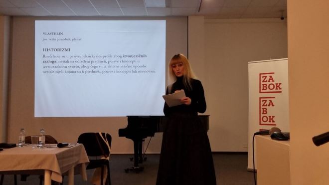 Tatjana Pišković u predavanju „Kronizmi u romanu U noći Ksavera Šandora Gjalskog“ bavi se vremenskom raslojenošću hrvatskog leksika i Gjalskijevim leksikom koji uspoređuje s današnjim. Efektno započinje čitanjem reprezentativnog ulomka iz romana U noći (1886., Vijenac) u kojem su vidljive zastarjele riječi – leksički kronizmi koje klasificira na historizme (nastale iz izvanjezičnih razloga) i arhaizme (nastale iz unutarjezičnih razloga) koje pritom dijeli na podskupine. Predavačica komunicira s publikom koja zajednički rješava odgonetke, odnosno značenja obilježenih riječi poput vlastelin, konškolarac, poznanac, prikaza, surci, gajtani, narodnjak, Ilirac… Uspoređuje riječi s današnjim leksikom i uspješno osuvremenjuje navedene primjere.
