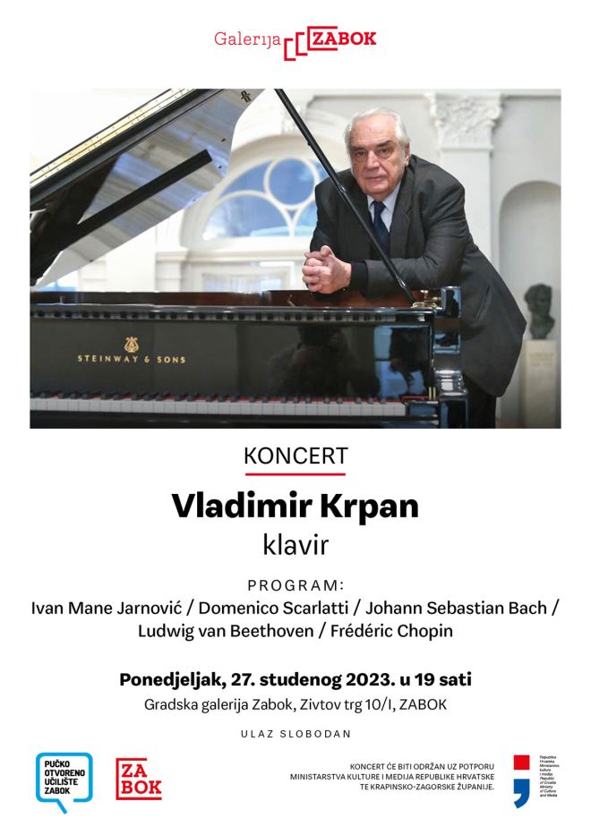 Pučko otvoreno učilište Zabok poziva vas na koncert Vladimira Krpana, u ponedjeljak, 27. studenog 2023. u 19 sati u Gradskoj galeriji, Zivtov trg 10/I.