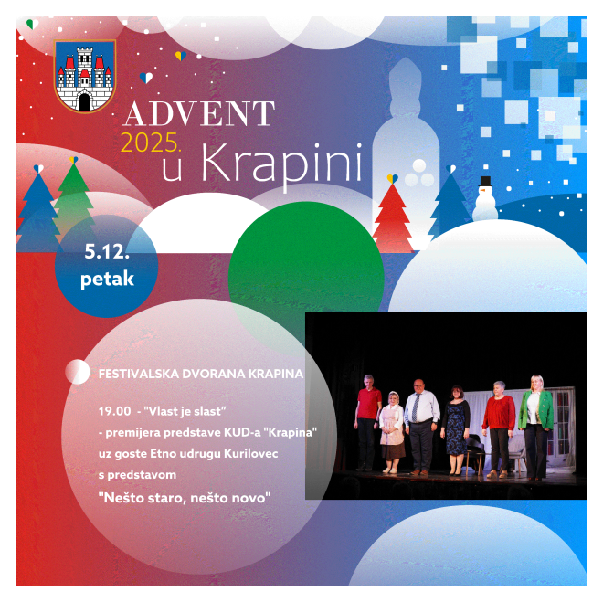 U petak 5. prosinca 2025. godine, u sklopu Adventa u Krapini, a povodom Dana Grada Krapine u Festivalskoj dvorani Pučkog otvorenog učilišta Krapina s početkom u 19 sati, održat će se premijera nove predstave KUD-a Krapina "Vlast je slast" autorice Štefice Fanjek, za kojeg adaptaciju teksta i režiju potpisuje Anita Tušek.