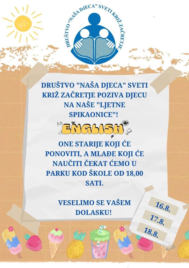Društvo ''Naša djeca'' Sveti Križ Začretje poziva na ljetne igraonice učenja engleskog za male i one malo veće. Radionice pod nazivom Ljetne spikaonice održat će se u utorak, srijedu i četvrtak (od 16. do 18. kolovoza), s početkom u 18 sati, u parku kod škole.