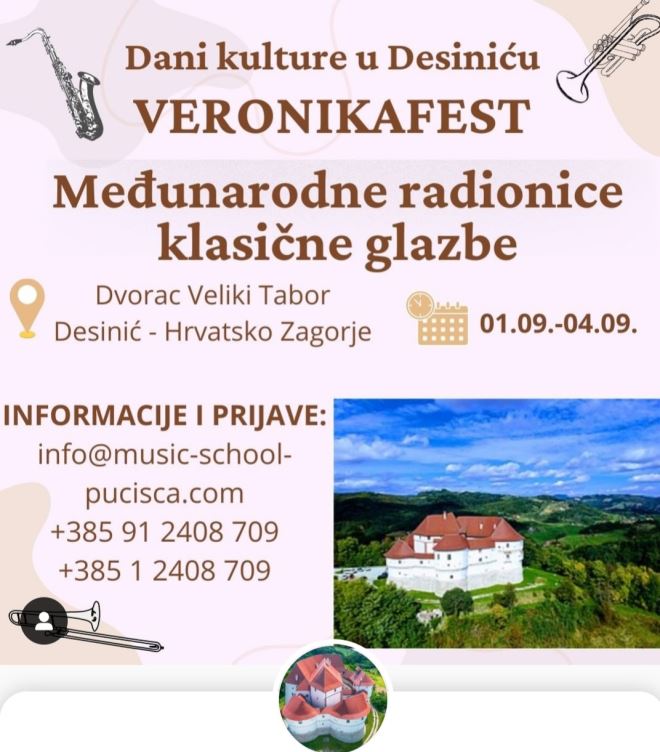 U sklopu manifestacije "Veronikafest" u Desiniću od 01.09.- 5.09.2022. u dvorcu "Veliki Tabor" u održat će se glazbene radionice klasične glazbe.