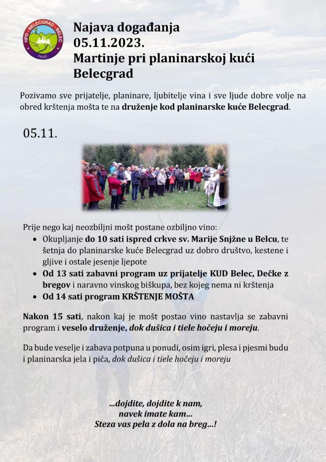 I ove godine održat će se planinarsko Martinje pri Planinarskoj kuću Belecgrad. Datum je 5. studeni, a okupljanje kod crkve sv. Marije Snježne u Belcu je do 10 sati, nakon čega slijedi šetnja do planinarske kuće Belecgrad.