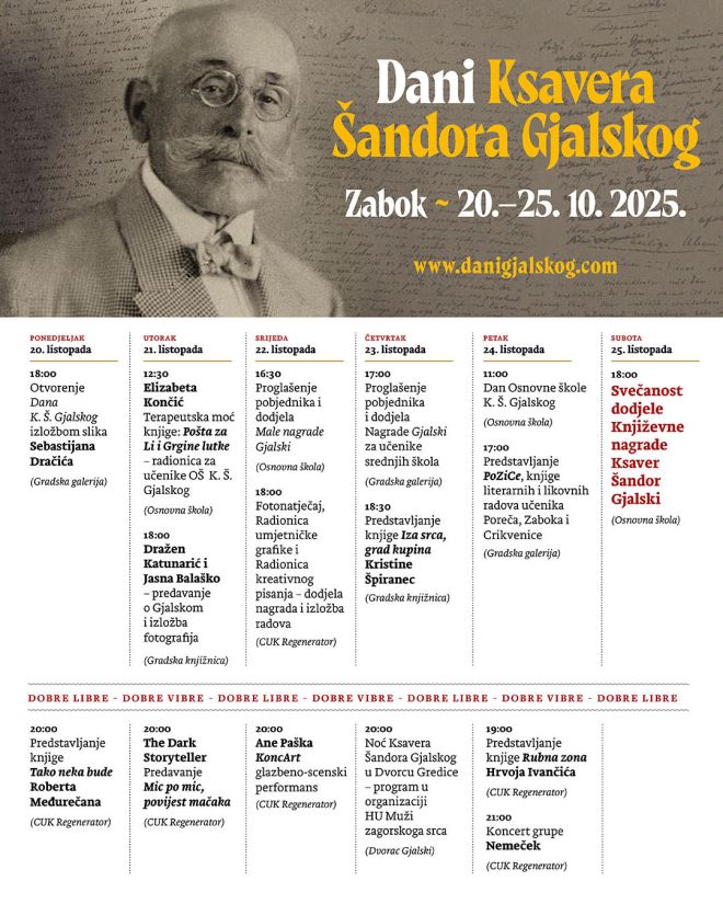Manifestacija Dani Ksavera Šandora Gjalskog, posvećena velikom zabočkom piscu i kroničaru zagorskog duha, od 20. do 25. listopada donosi bogat program događanja koja povezuju književnost, likovnu umjetnost, glazbu i suvremenu kulturu.