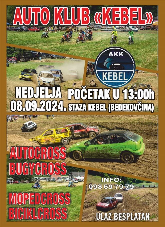 Auto klub “Kebel” u nedjelju, 8. rujna 2024. godine, organizira utrke na stazi u Keblu u kategorijama: autocross, bugycross, mopedcross i biciklcross.