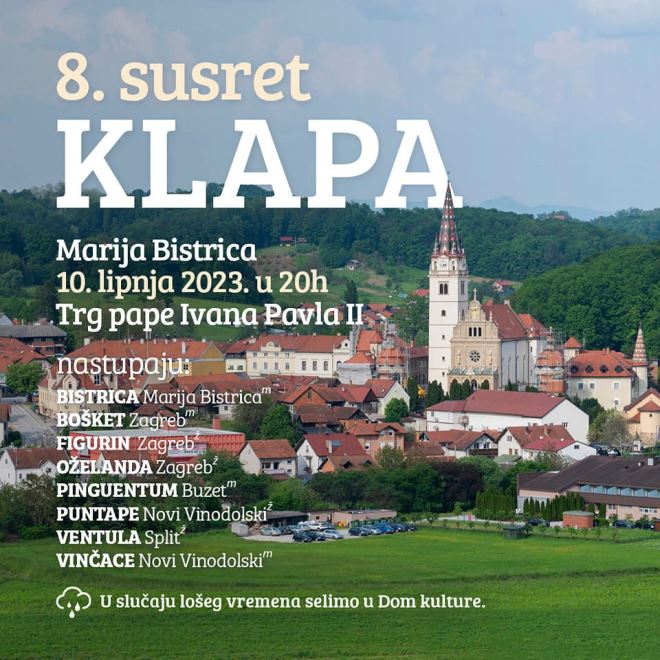 Klapa Bistrica organizira 8. susret klapa u Mariji Bistrici, u subotu 10. lipnja od 20 sati. Susrest će se održati na trgu pape Ivana Pavla II, ili u slučaju kiše u Domu kulture u Mariji Bistrici.